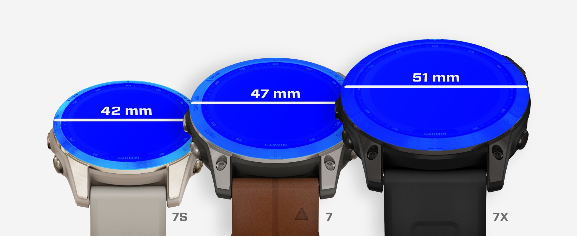 - Fenix 7 S är den minsta storleken, främst riktad till kvinnor. Den mäter 42 mm i diameter