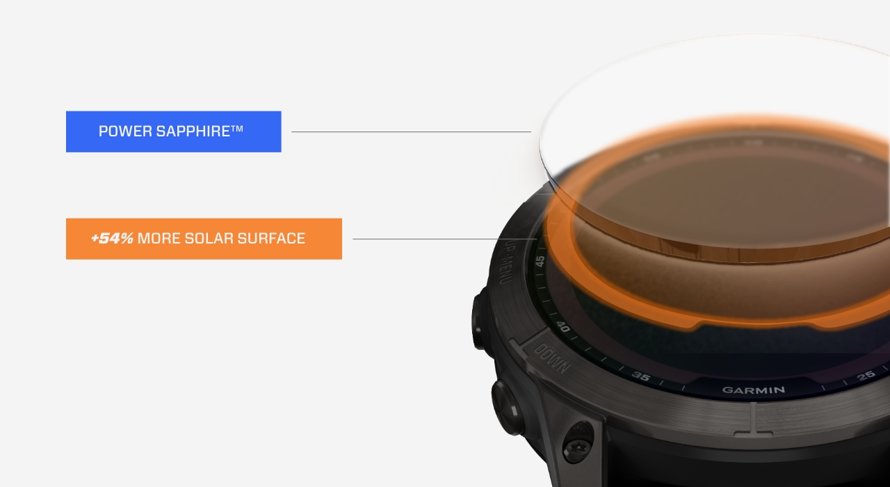 En annan nyhet som kommer glädja många Fenix-älskare är möjligheten att få både solpaneler och safirglas. Dessutom har alla solpaneler i Fenix 7 blivit större, så de nu täcker hela skärmen, vilket innebär att de fångar över 300% mer solenergi än i Fenix 6 Solar.