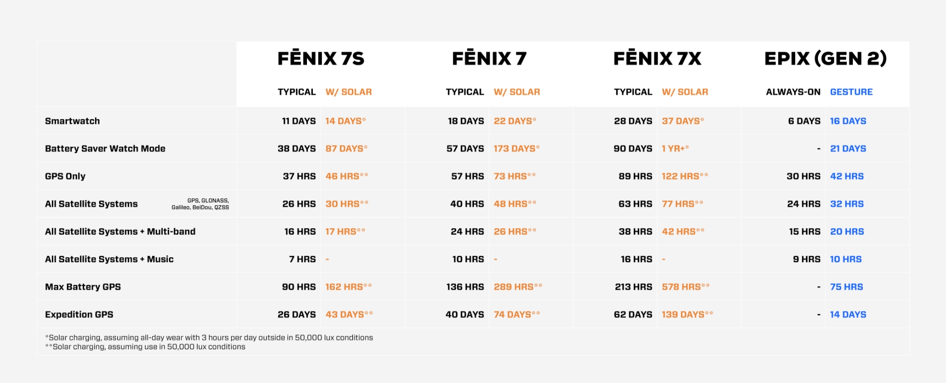 En av de största nyheterna i Fenix 7 är den förbättrade batteritiden. Alla klockor i Fenix 7-serien har fått solida uppgraderingar. Speciellt i GPS-läge kommer de flesta löpare märka en tydlig skillnad. En Fenix 7 i vanlig storlek håller exempelvis 72% bättre på batteriet i GPS-läge än en Fenix 6.