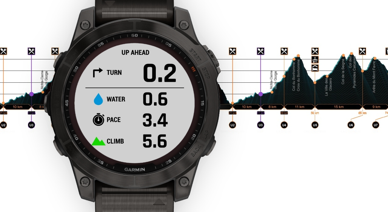 Om du före en löprunda eller tävling lägger in den rutt du har tänkt springa kan Garmin Fenix 7 med den nya funktionen Up-Ahead berätta vad som kommer att hända på rutten. Den kan visa dig när du ska svänga nästa gång, när nästa vätskestation är, hur brant nästa backe är osv.