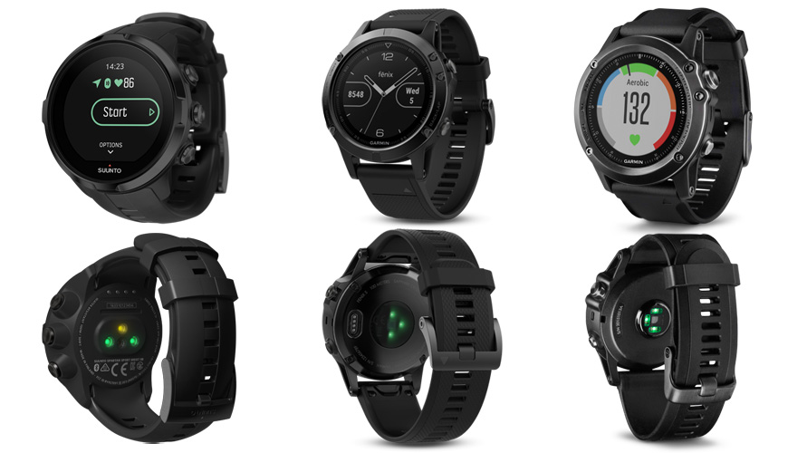 Vänster: Suunto Spartan Wrist HR. Mitten: Garmin Fenix 5 Sapphire. Höger: Garmin Fenix 3 HR.